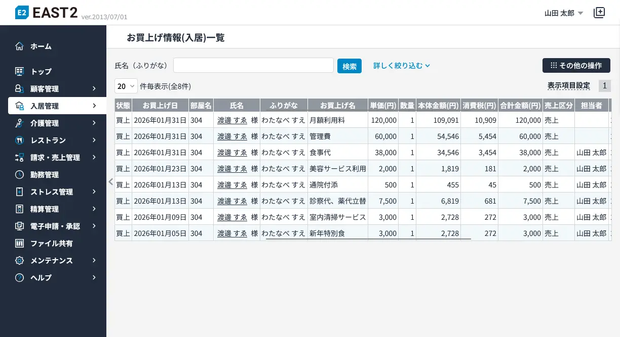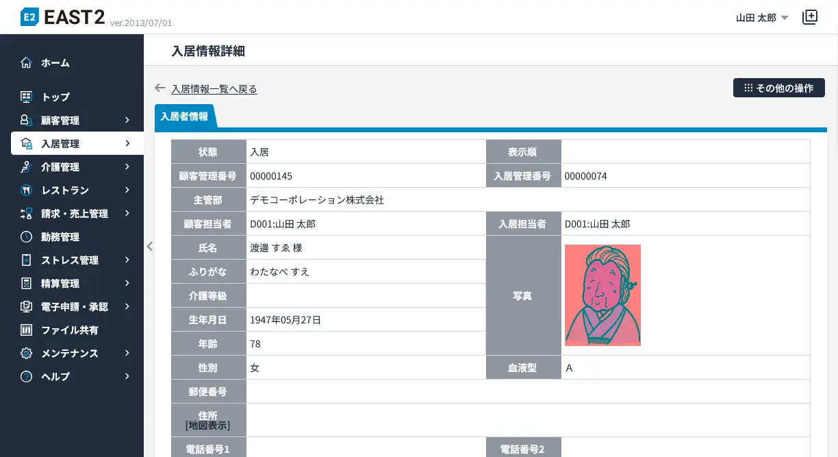 | 入居管理 | 入居登録、入居者情報、契約情報、請求情報、連絡先、かかりつけ医、同居者登録、住替、退去 | |