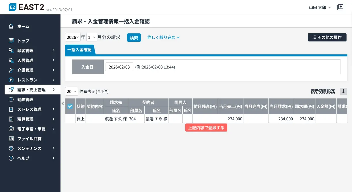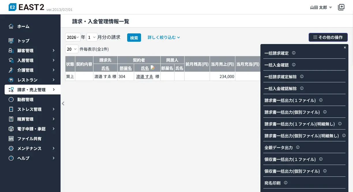 | 請求・入金管理 | 請求確定、一括請求確定、請求書出力、領収書出力、引落FBデータ出力、宛名印刷、入金確認、一括入金管理、入金FBデータ取込 | |